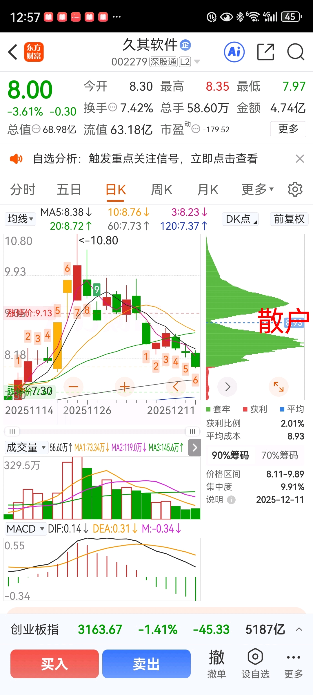 $久其软件(SZ002279)$ 看看筹码峰,是不是鳄鱼嘴,咬的全是散户的带血筹码.#复盘记录# #炒股日记# #周度策略#