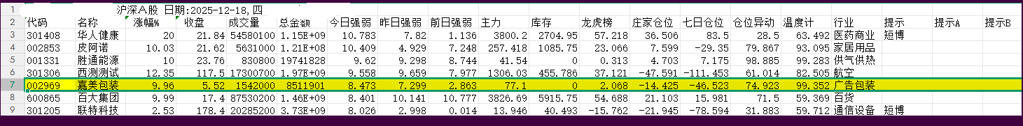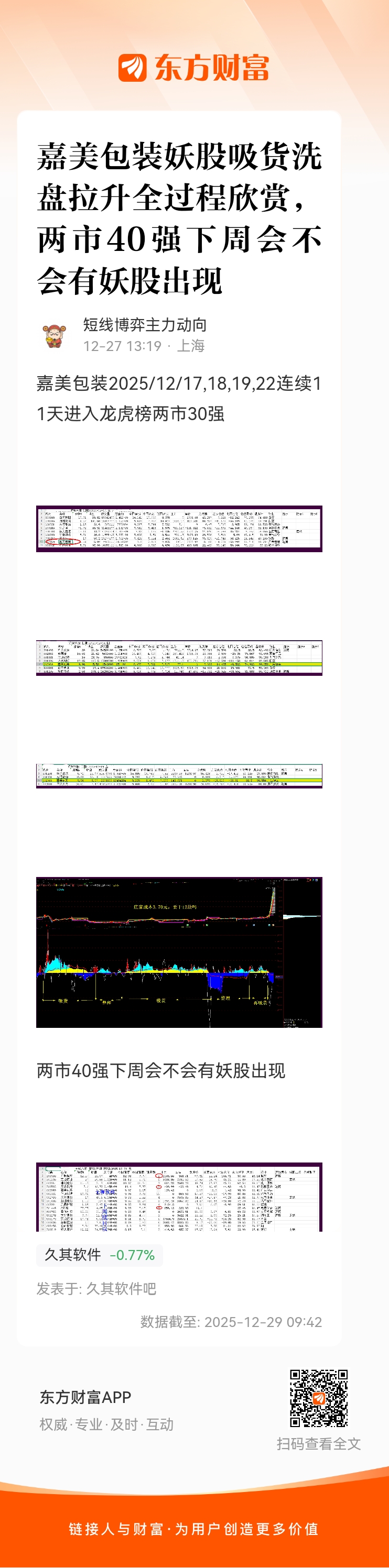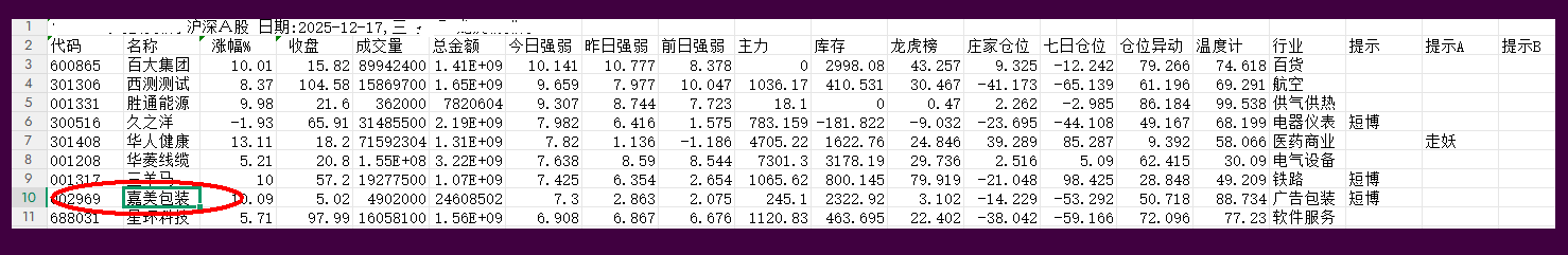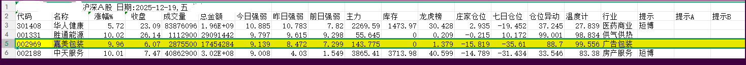 嘉美包装2025/12/17,18,19,22连续11天进入龙虎榜两市30强