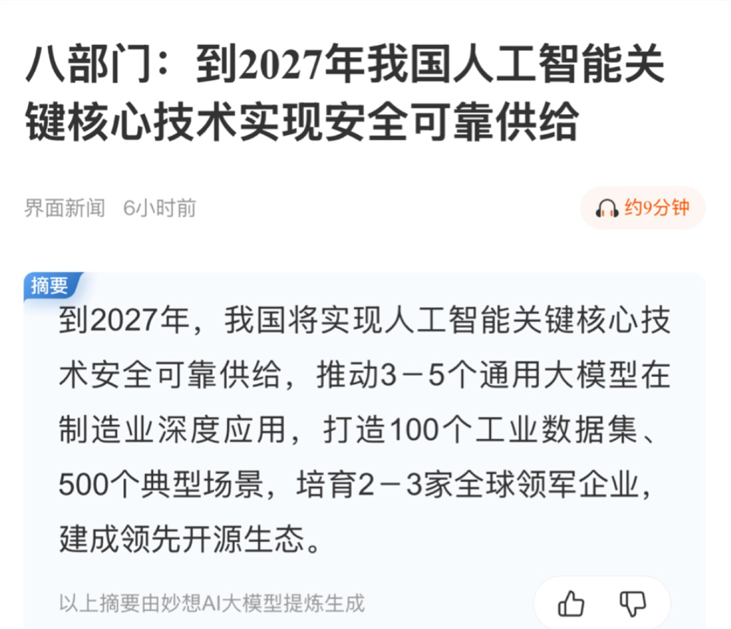 今天八部门联合印发的人工智能+制造,说白了就是软硬协同发展,让人工智能应用到制造
