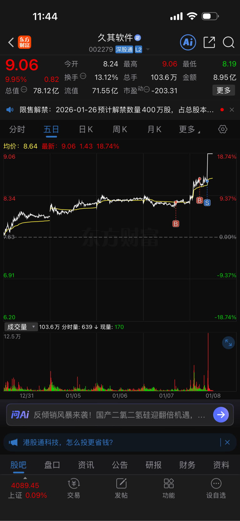 今天买了300股,后来感觉不对8.59卖掉3万股