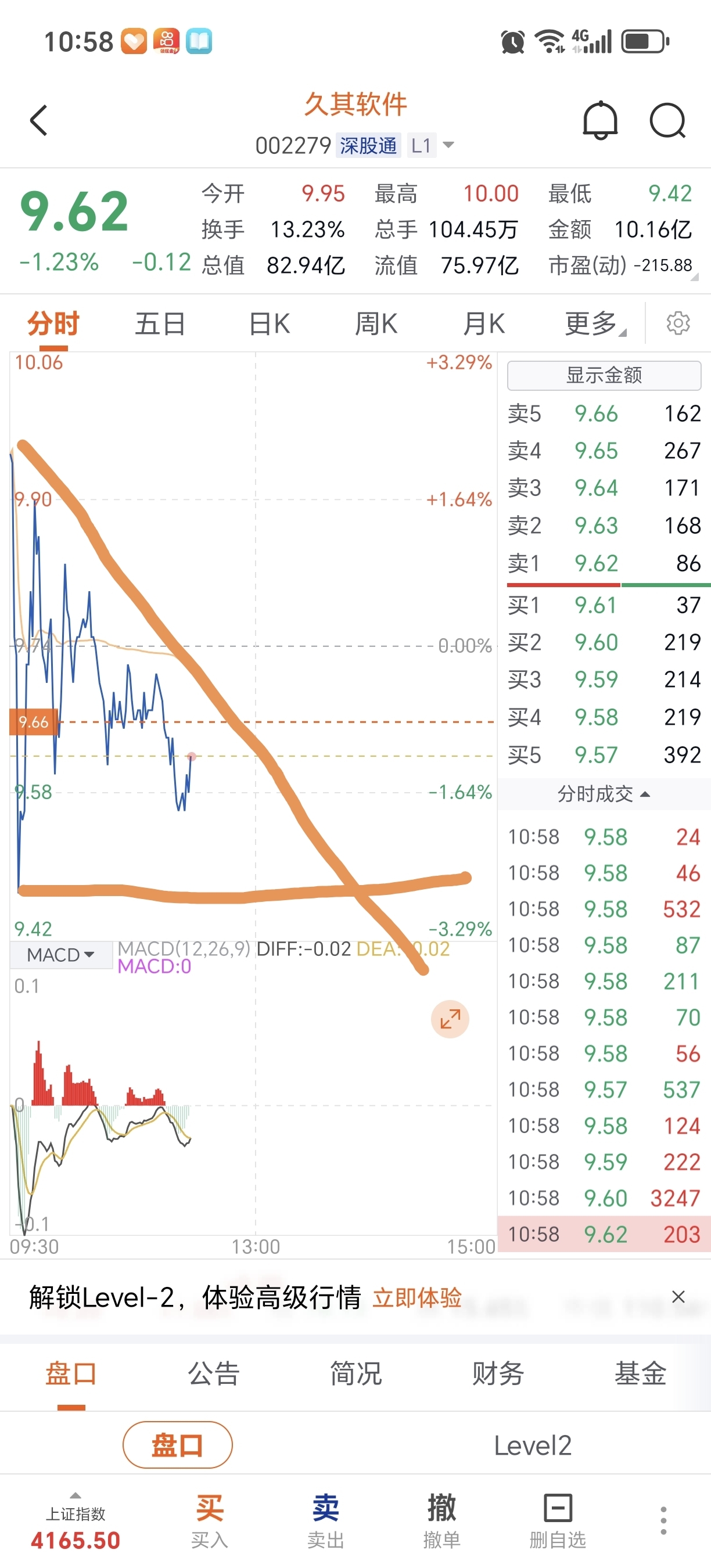 $久其软件(SZ002279)$ 早上没跑,现在被套,沿着三角形的斜边,一路向下。