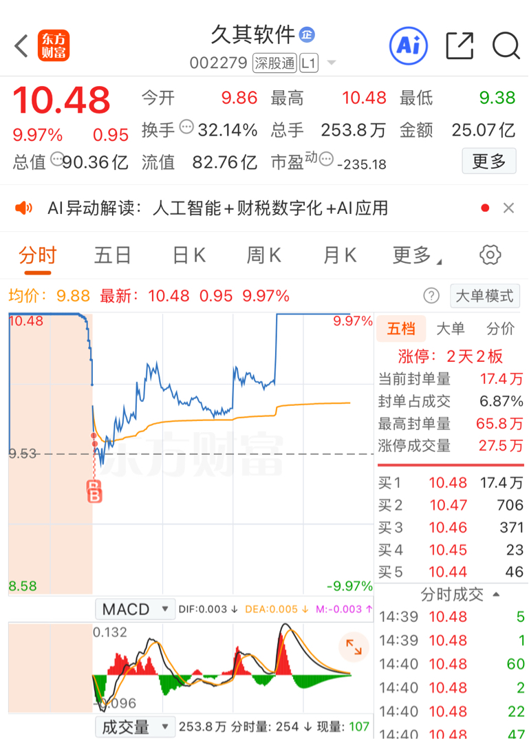 久其软件昨天一字板后,筹码峰缩了不少,看日线走势很健康。昨晚复盘果断加入自选,没