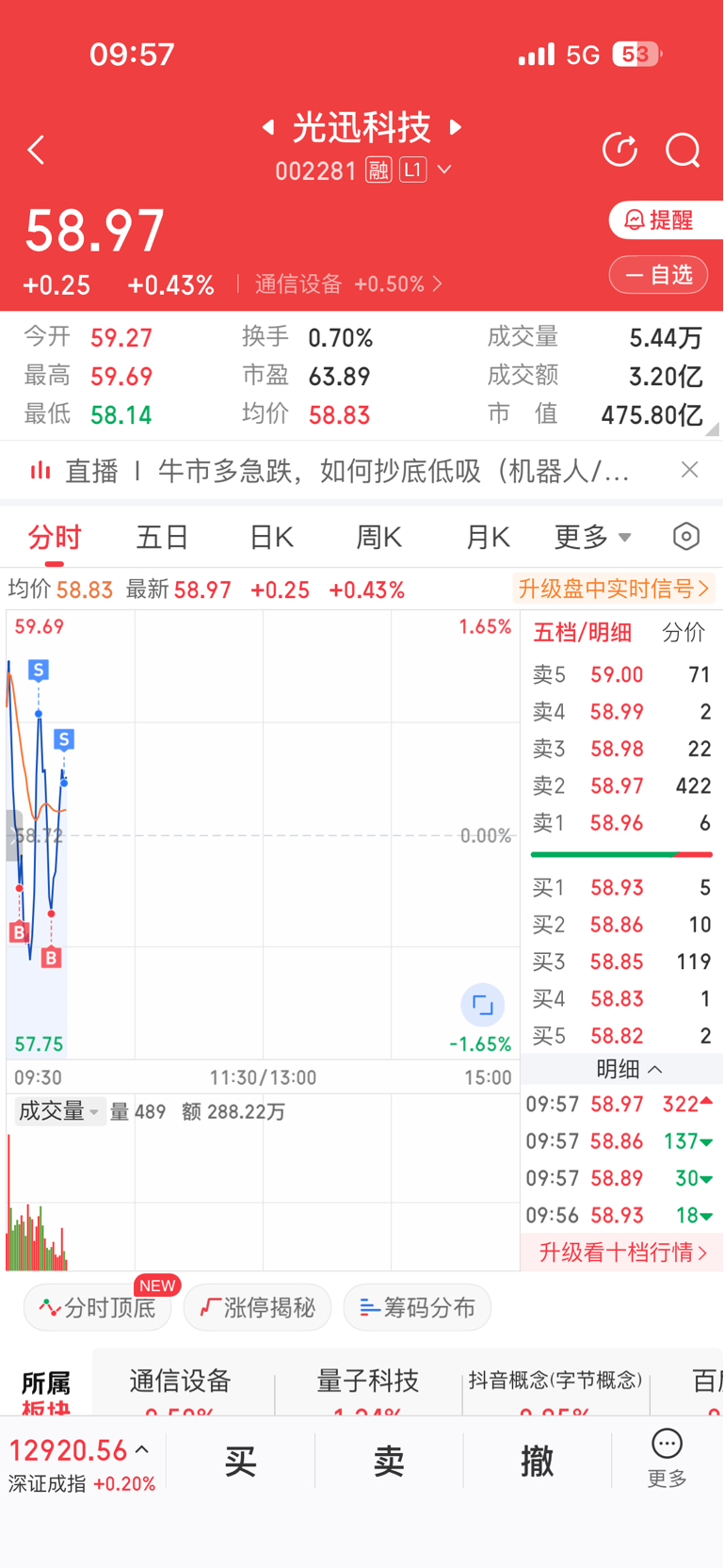 $光迅科技(SZ002281)$ 开盘做了个t,就没看,刚打开来看了一下,居然还是跌