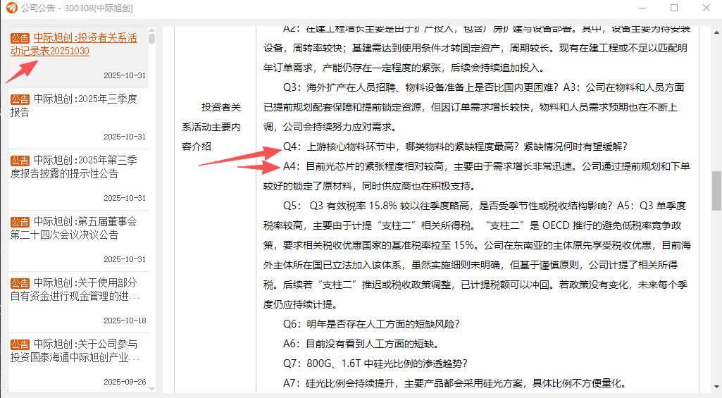 中际旭创(300308):目前光芯片的紧张程度相对较高。光迅科技是自研光芯片的。
