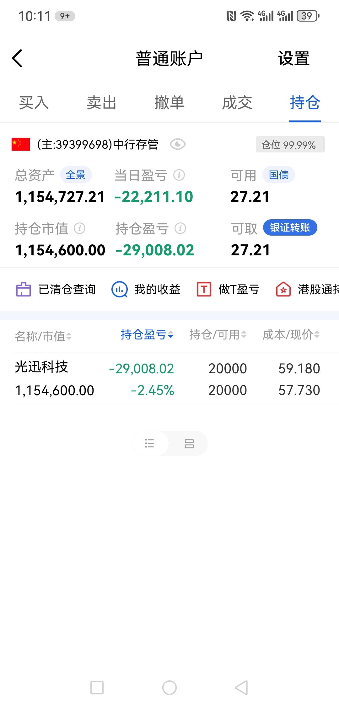 $光迅科技(SZ002281)$ 从63元T59元!从18600做到2万股!定增股价能跌哪去!原始股东庄家股票不是钱吗!要赔大家一起赔!怕什么?有时一只股票赔10多万太正常了。就得每次买股票挣钱吗?我看好光迅科技!等!做T。不看好清仓走人!没人让你买!姜太公钓鱼,愿者上钩。股票风险慎重买卖!阿弥陀佛!