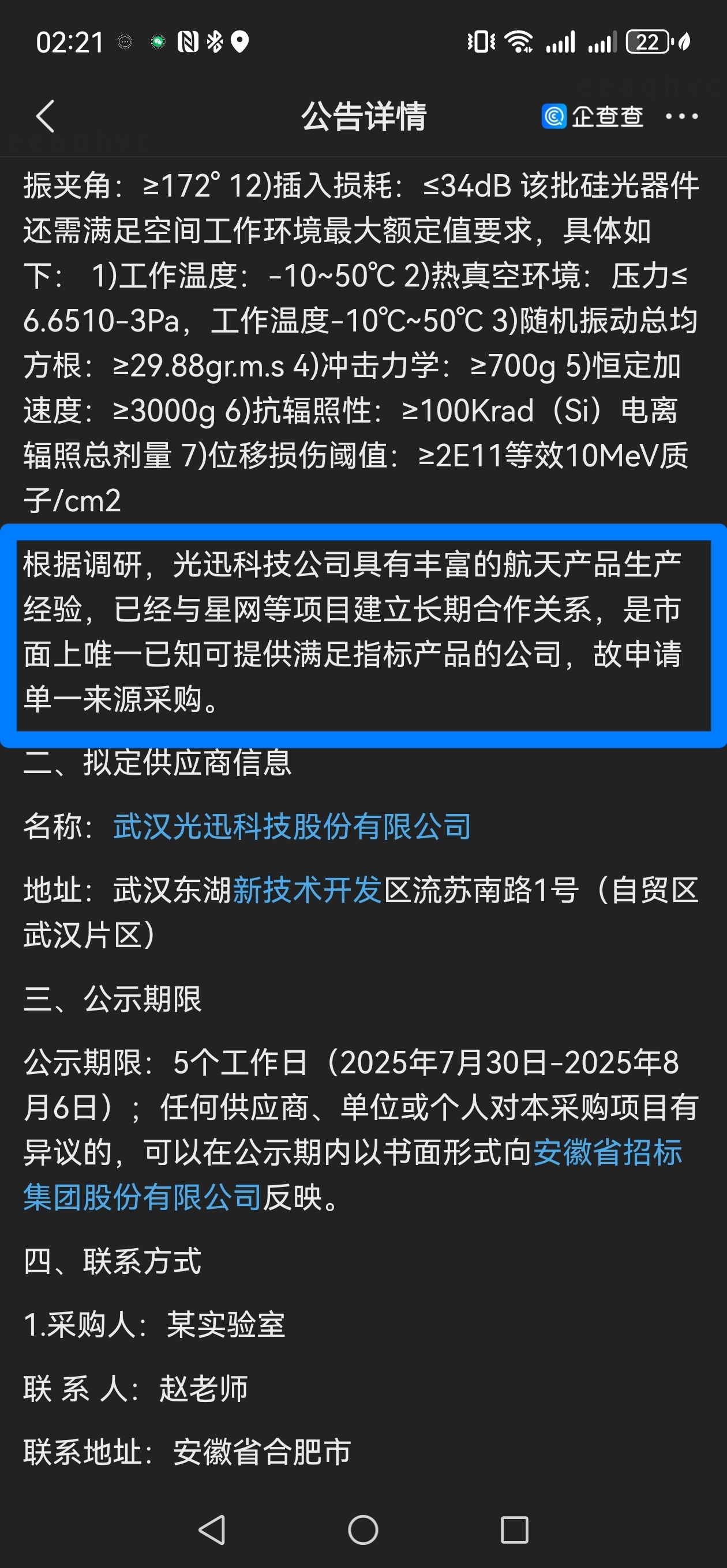 光迅董秘不说话,很多关于商业航天的信息主要来源于雪球和东方财富未认证信息,找了很多公开信息,以下中标信息透有用的信息!