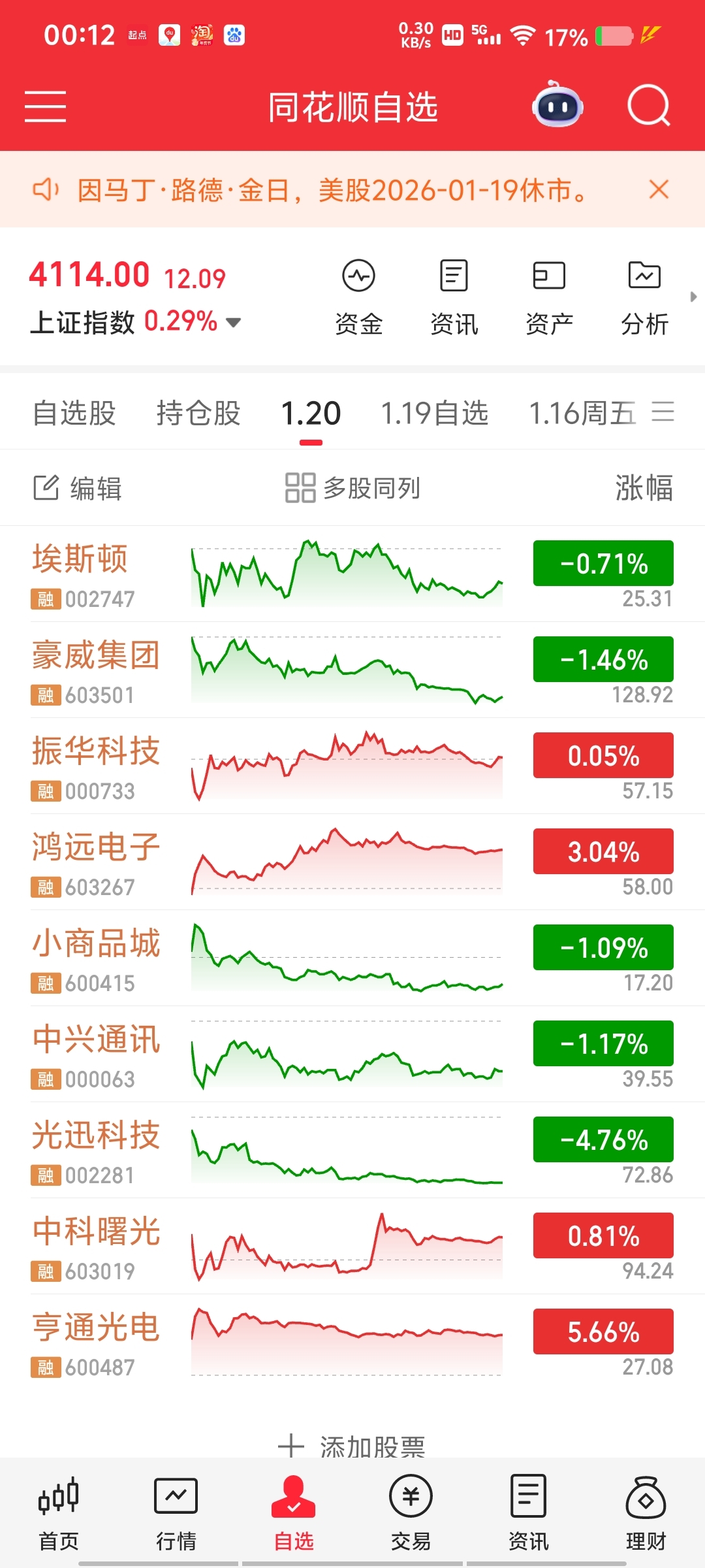 #炒股日记# 1.20股池$光迅科技(SZ002281)$ $中兴通讯(SZ000063)$