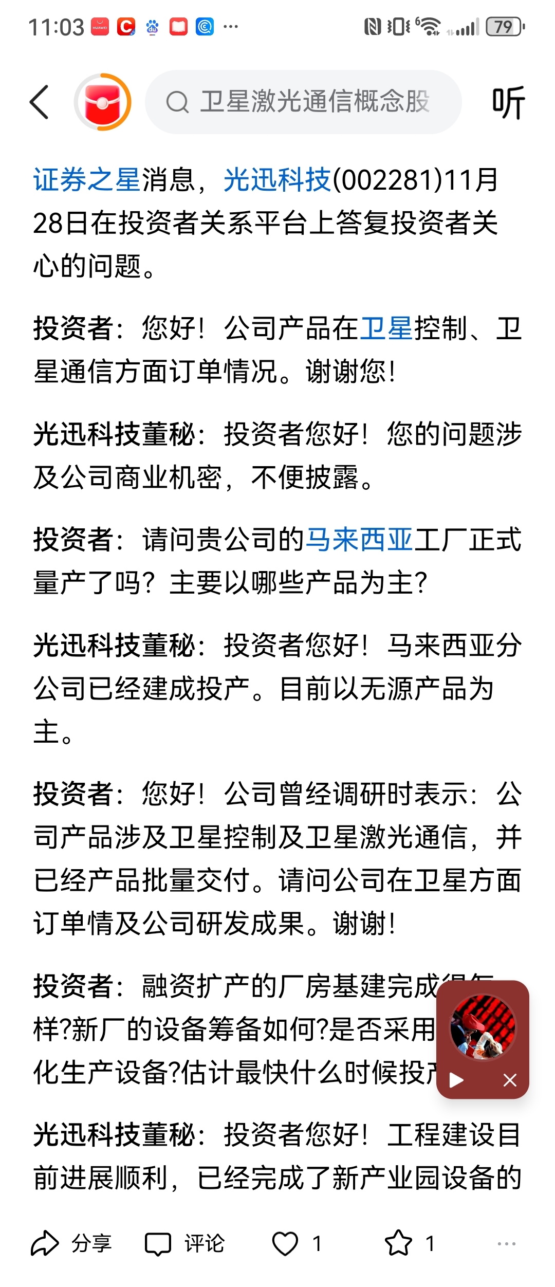 $光迅科技(SZ002281)$ 看以前互动易公告,基本判断具备核心技术和业务,公司回答是商业机密。国内激光通信第一股应该是真的。