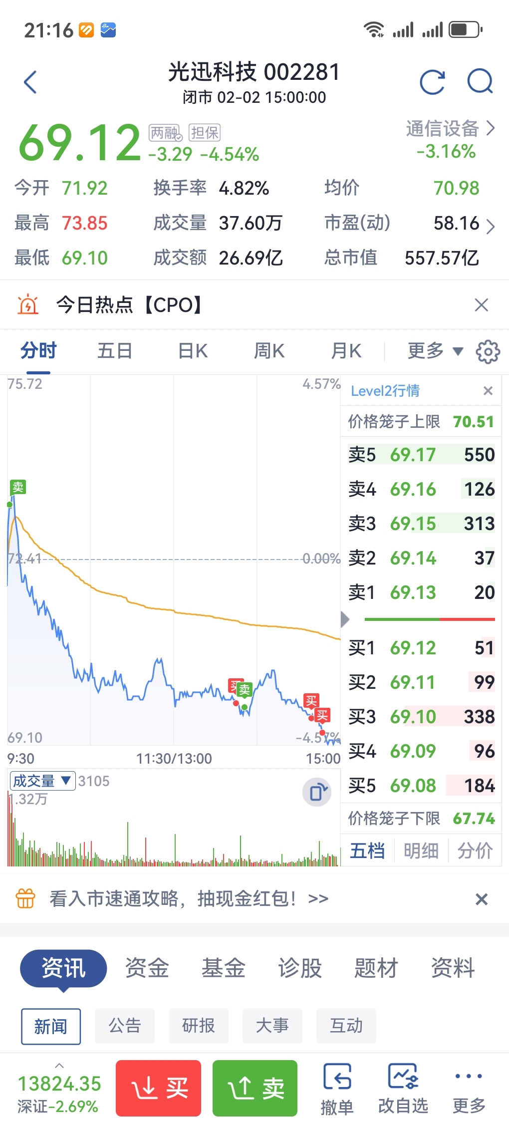 $光迅科技(SZ002281)$ 卖吧! 70以下我收,没筹码怎么玩