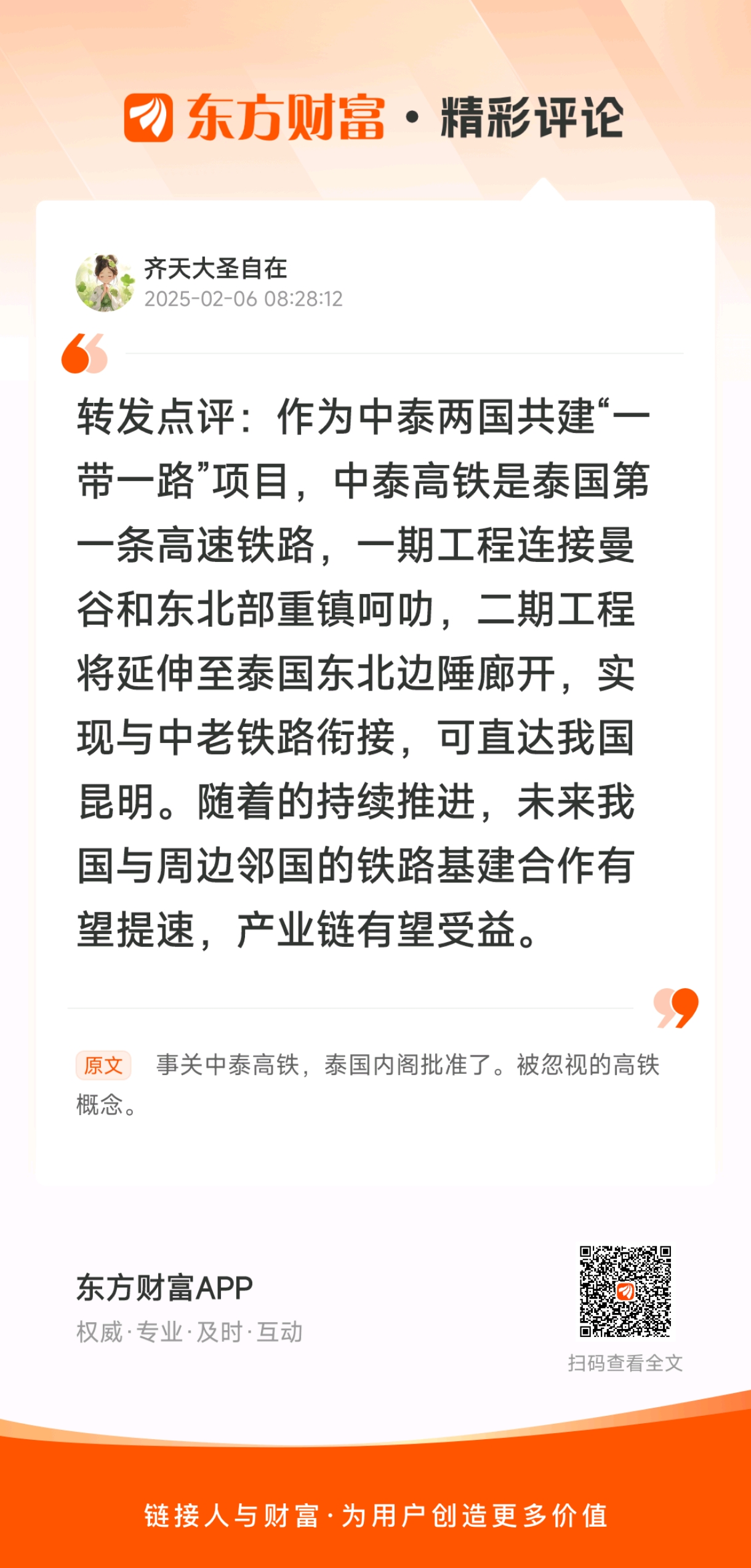 //@齐天大圣自在 :转发点评:作为中泰两国共建“一带一路”项目,中泰高铁是泰国第一条高速铁路,一期工程连接曼谷和东北部重镇呵叻,二期工程将延伸至泰国东北边陲廊开,实现与中老铁路衔接,可直达我国昆明。随着的持续推进,未来我国与周边邻国的铁路基建合作有望提速,产业链有望受益。