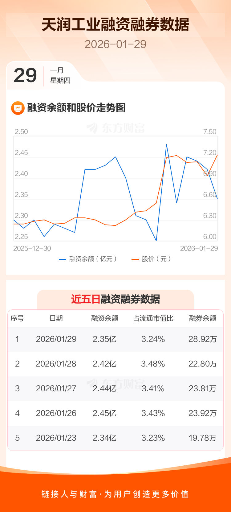 交易所最新数据显示,天润工业于2026年1月29日获融资买入4585.75万元,融资偿还5246.94万元,当日融资净偿还661.18万元。目前,该股融资余额2.35亿,占流通市值比例为3.24%。