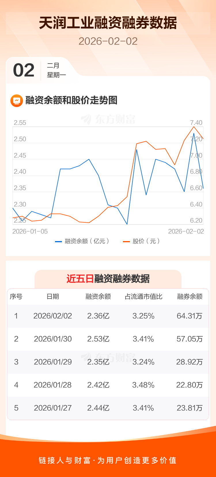 交易所最新数据显示,天润工业于2026年2月2日获融资买入3415.14万元,融资偿还5097.03万元,当日融资净偿还1681.88万元。目前,该股融资余额2.36亿,占流通市值比例为3.25%。