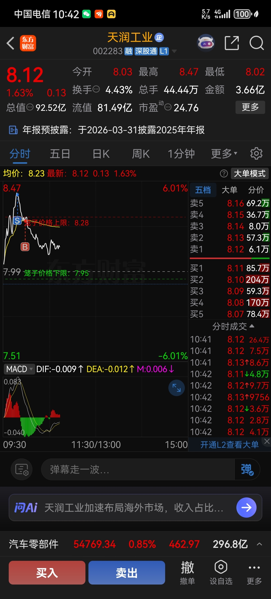 $天润工业(SZ002283)$ 早知道你这么弱,8.45直接清了