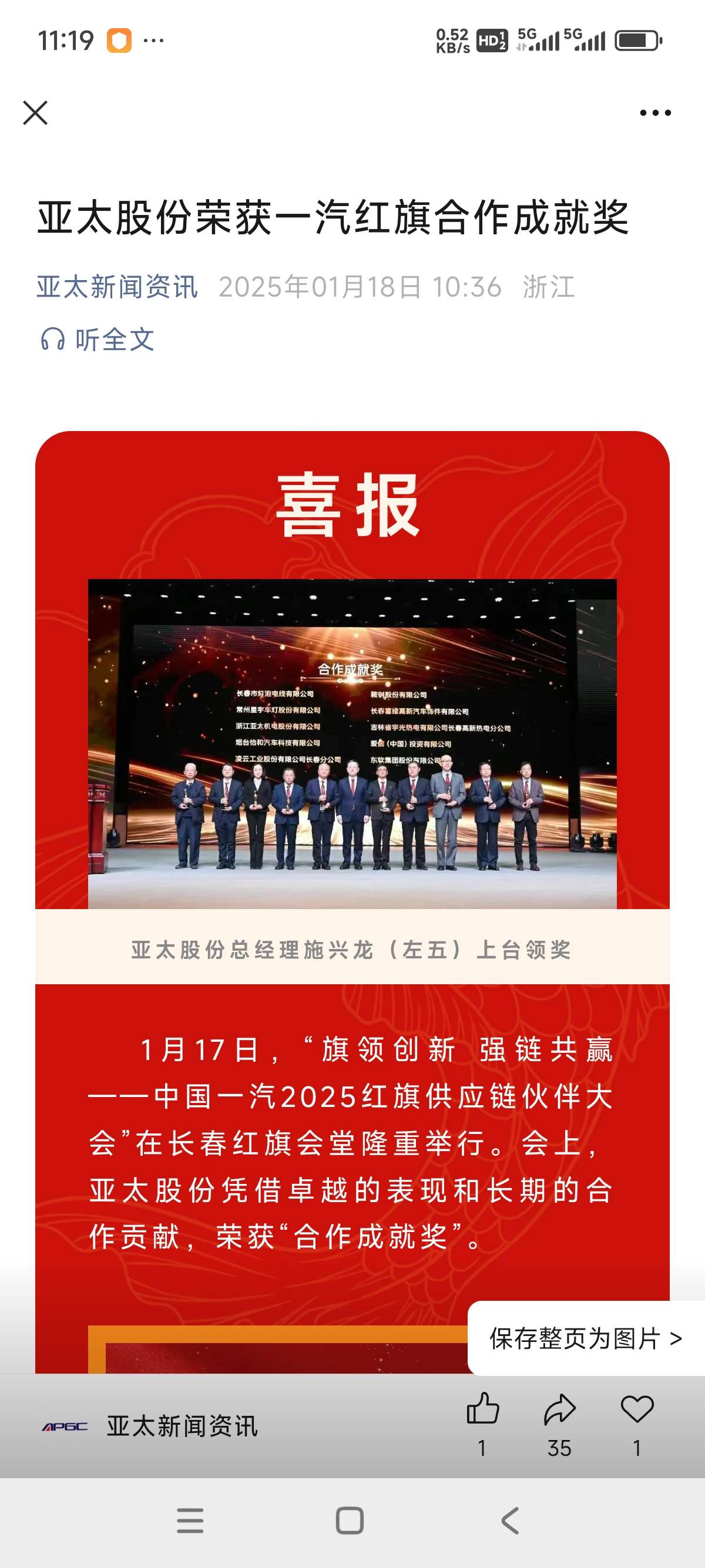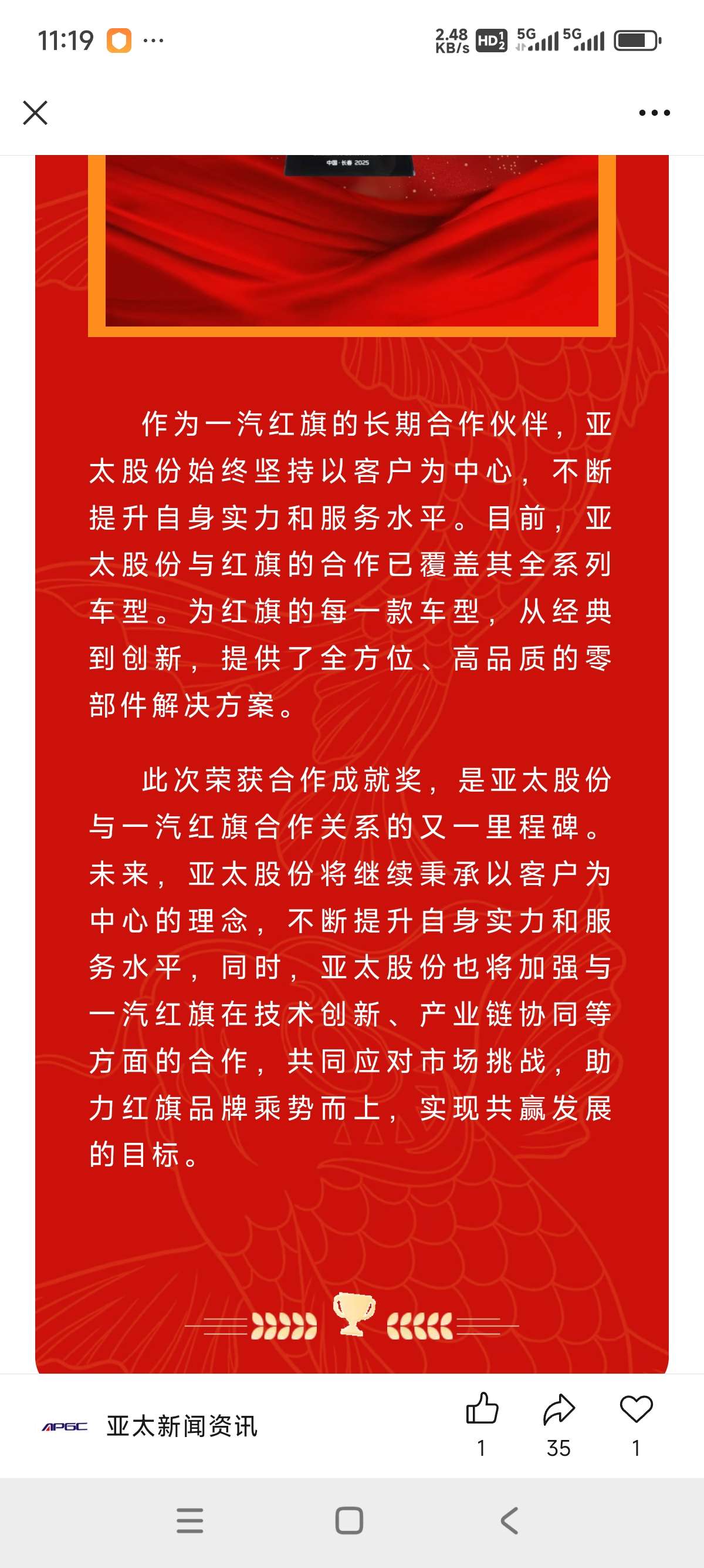 作为一汽红旗的长期合作伙伴,亚太股份始终坚持以客户为中心,不断提升自身实力和服务水平。目前,亚太股份与红旗的合作已覆盖其全系列车型。为红旗的每一款车型,从经典到创新,提供了全方位、高品质的零部件解决方案。