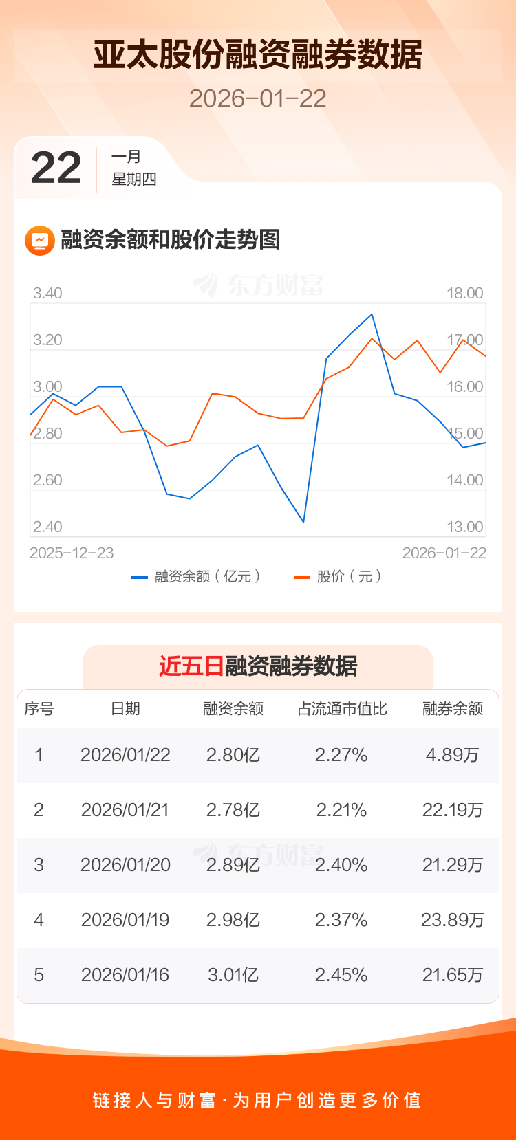 交易所最新数据显示,亚太股份于2026年1月22日获融资买入3137.67万元,融资偿还2936.13万元,当日融资净买入201.54万元。目前,该股融资余额2.80亿,占流通市值比例为2.27%。