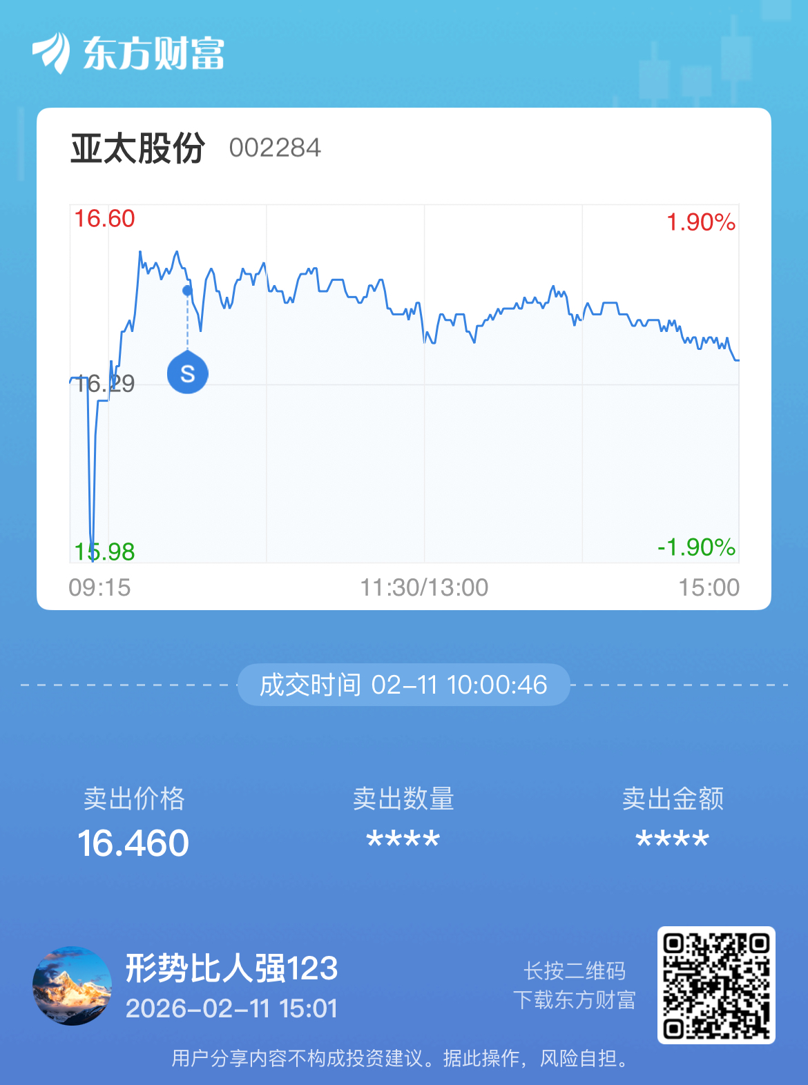 温馨提示: 1.根据《证券法》规定,禁止编造、传播虚假信息或者误导性信息,扰乱证券市场;2.用户在本社区发表的所有资料、言论等仅代表个人观点,与本网站立场无关,不对您构成任何投资建议。用户应基于自己的独立判断,自行决定证券投资并承担相应风险。《东方财富社区管理规定》