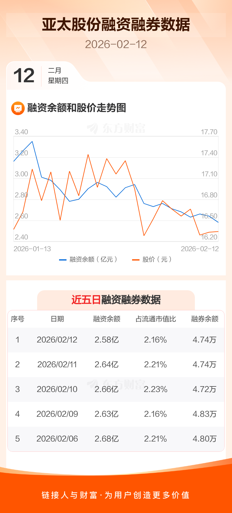 交易所最新数据显示,亚太股份于2026年2月12日获融资买入884.34万元,融资偿还1443.76万元,当日融资净偿还559.42万元。目前,该股融资余额2.58亿,占流通市值比例为2.16%。
