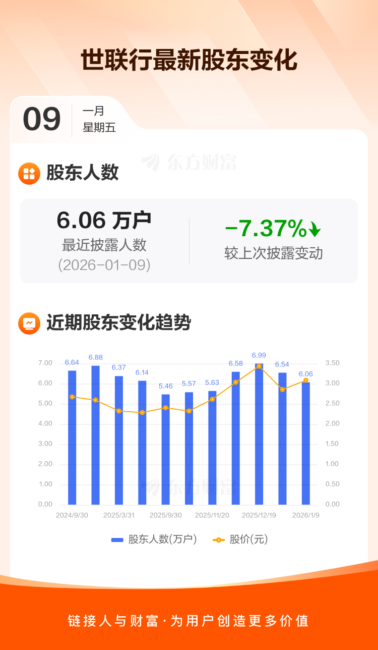 世联行:截至1月9日最新股东户数6.06万户,较上期减少7.37%