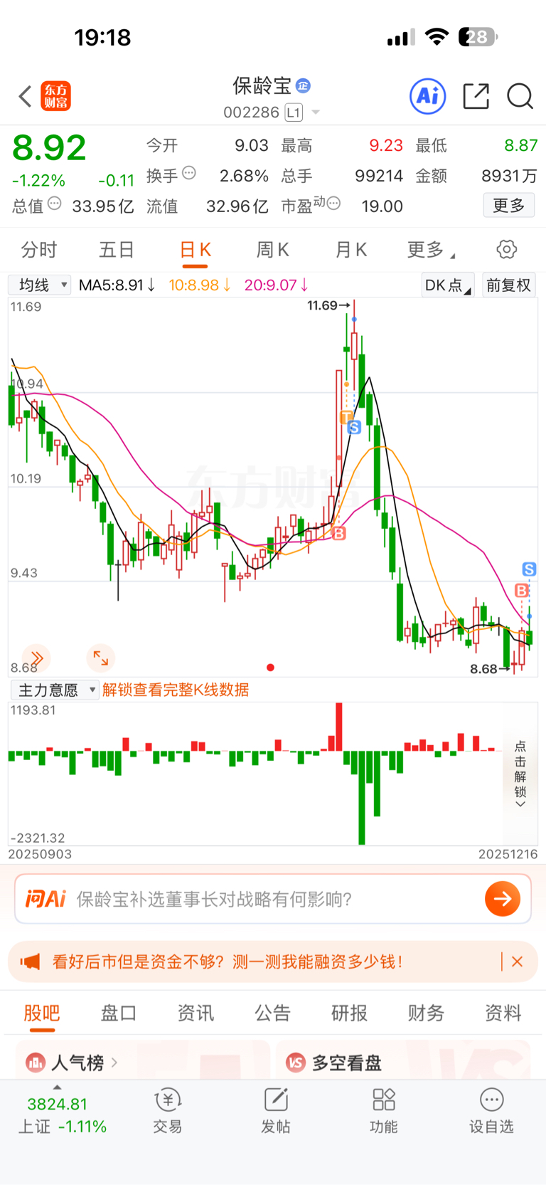 $保龄宝(SZ002286)$ 今天大盘太差了,带了一点点利润走了。我还会回来的