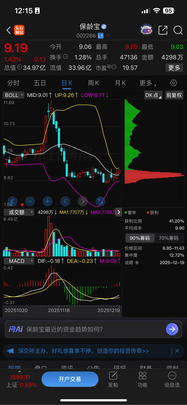 $保龄宝(SZ002286)$ 筹码峰底部集中,布林带收窄,变盘在即!静待放量穿云箭