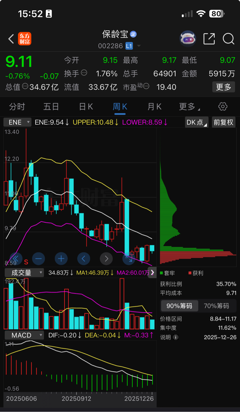 $保龄宝(SZ002286)$ 很好,保龄宝周线空头下降趋势,macd零轴附近,这个位置筹码峰堆积,左侧交易可半仓介入,右侧交易耐心等待趋势明朗@妙想