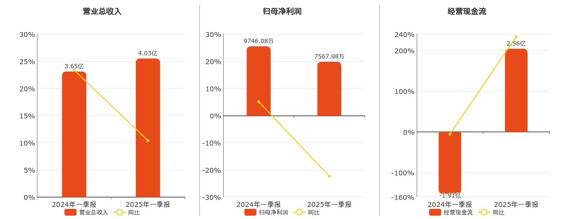 公司营业总收入为4.03亿元。归母净利润为7567.98万元,较去年同报告期归母净利润减少2178.10万元,同比较去年同期下降22.35%。经营活动现金净流入为2.56亿元。