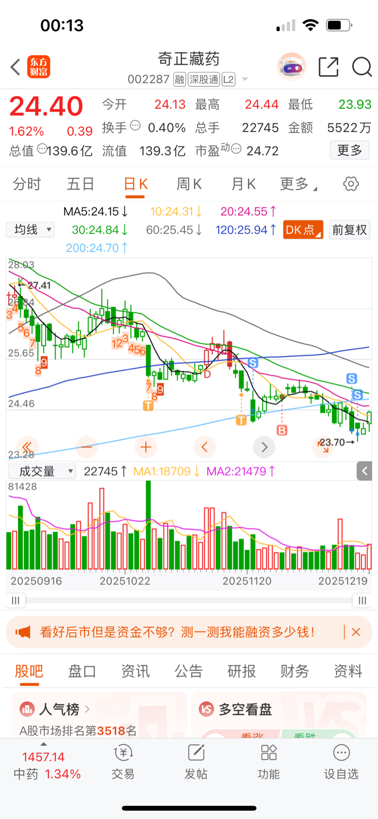 $奇正藏药(SZ002287)$ 做了两次低卖高买,在底部卖了剩1手,结果开始涨了