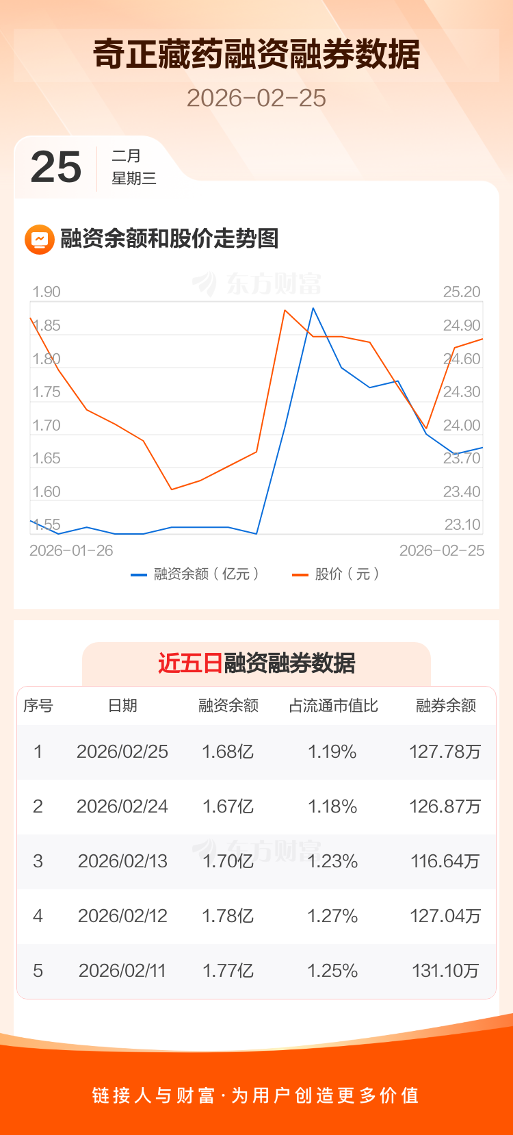 交易所最新数据显示,奇正藏药于2026年2月25日获融资买入1087.42万元,融资偿还949.83万元,当日融资净买入137.59万元。目前,该股融资余额1.68亿,占流通市值比例为1.19%。