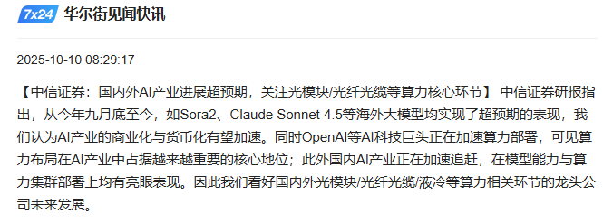 算力布局在AI产业中占据越来越重要的核心地位;此外国内AI产业正在加速追赶,在模型能力与算力集群部署上均有亮眼表现。因此我们看好国内外光模块/光纤光缆/液冷等算力相关环节的龙头公司未来发展。