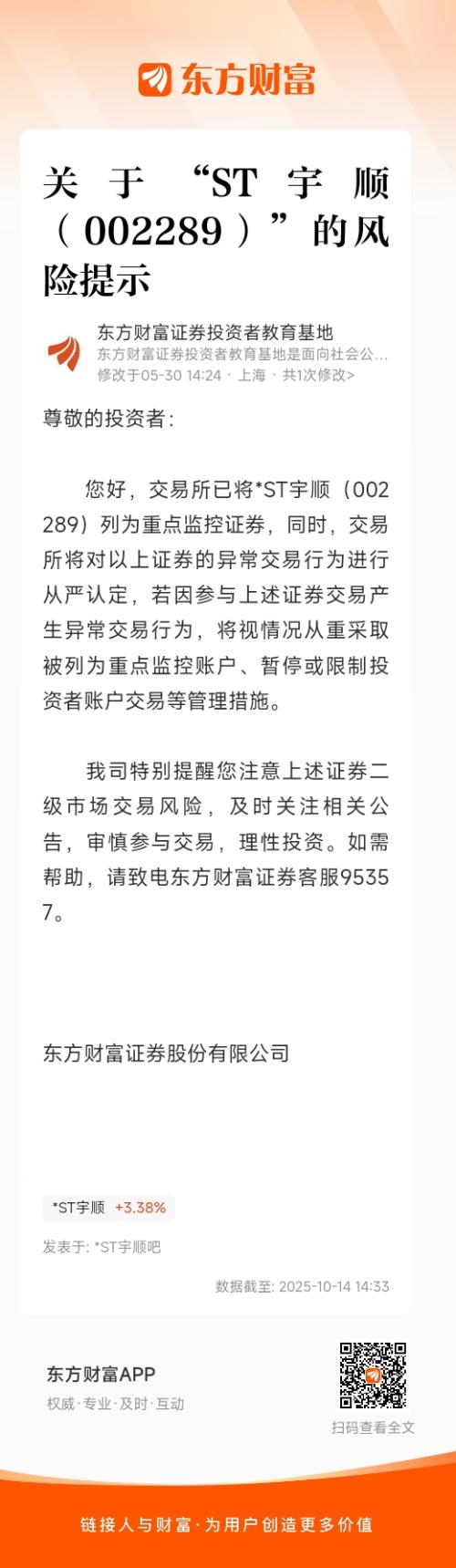 您好,交易所已将*ST宇顺(002289)列为重点监控证券,同时,交易所将对以上证券的异常交易行为进行从严认定,若因参与上述证券交易产生异常交易行为,将视情况从重采取被列为重点监控账户、暂停或限制投资者账户交易等管理措施。