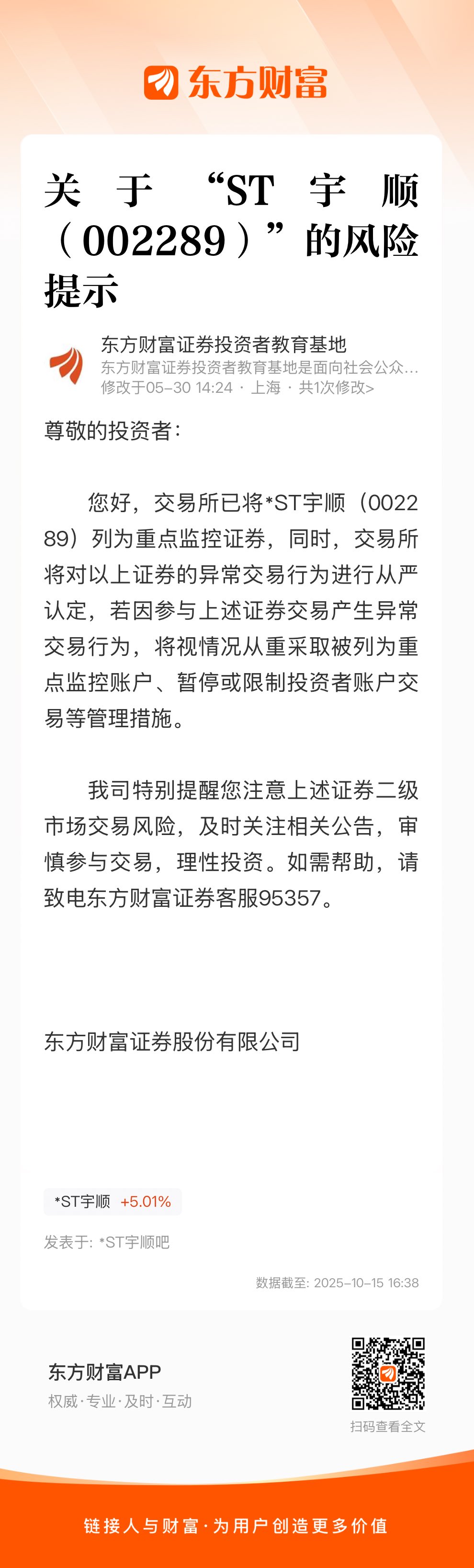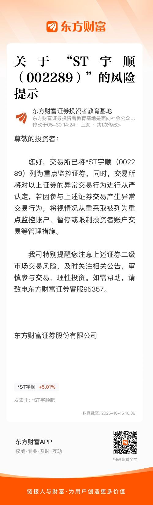 您好,交易所已将*ST宇顺(002289)列为重点监控证券,同时,交易所将对以上证券的异常交易行为进行从严认定,若因参与上述证券交易产生异常交易行为,将视情况从重采取被列为重点监控账户、暂停或限制投资者账户交易等管理措施。