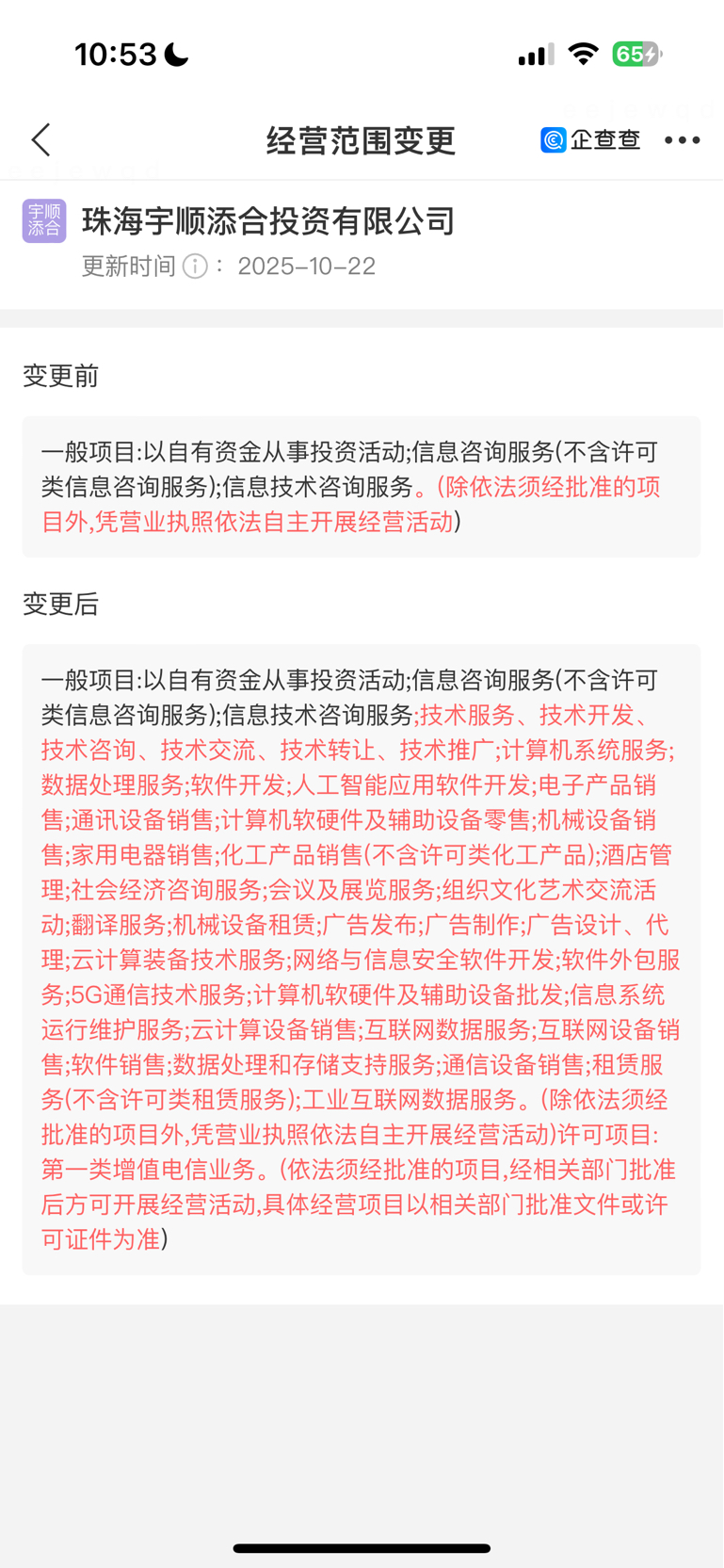 $*ST宇顺(SZ002289)$ 宇顺的子公司刚刚已经变更完营业执照的经营范围,变更了数据中心业务,云计算服务,宇顺随时出公告开启算力新征程