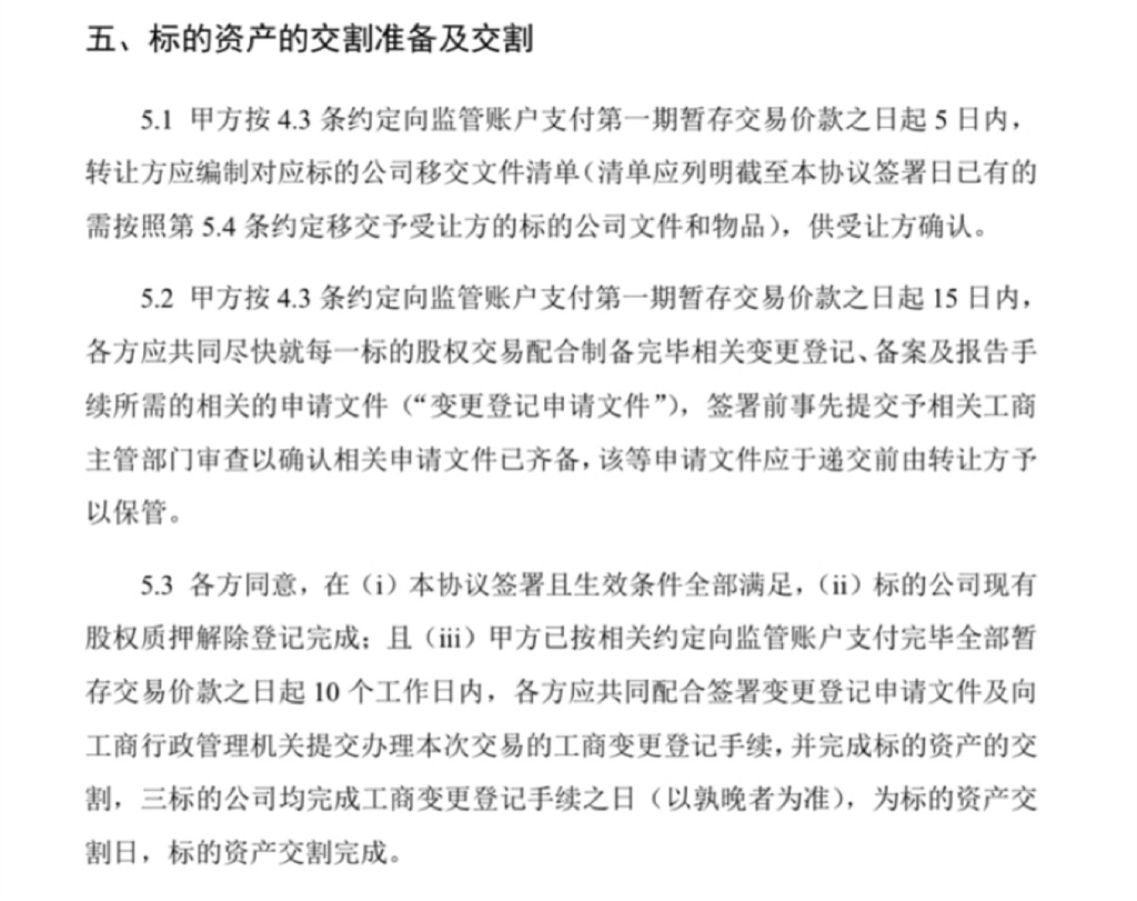 公司与相关方正在有序开展工作,说明工商变更文件准备正常,明天31号付尾款,逾期罚款150万每日,违约解除合同直接赔6.6亿
