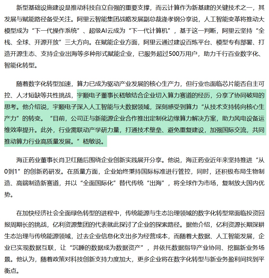 宇顺电子深入人工智能与大数据领域,深刻感受到算力“从技术支持转向核心生产力”的转变。“目前,公司正与新能源企业合作推出定制化边缘算力解决方案,助力风电设备运维效率提升。此外,行业需联动产学研力量,打通技术壁垒、避免重复建设,加强国际交流,共同推动算力行业高质量发展。”嵇敏说。