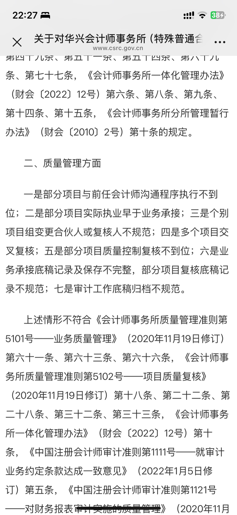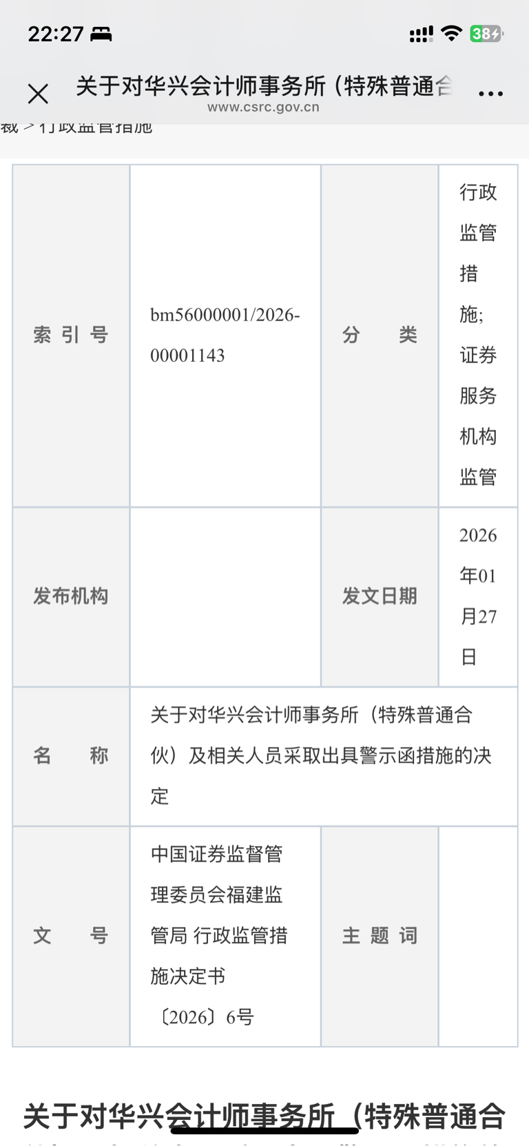 $*ST宇顺(SZ002289)$ 更换会计师事务所的初衷是想换一个更大的会计师事务所,但不巧的是华兴被罚。被罚的日期是1月27日。惯例,证监局官网对外披露信息会晚于1月27日很多。而宇顺的更换公告是在1月26日。