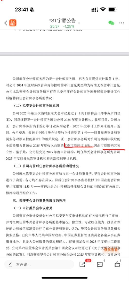 与其他ST公司不同,原先的正一事务所并没有请辞,而是宇顺出于年报考虑要更换更大的。