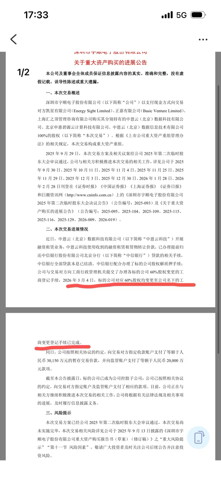 $*ST宇顺(SZ002289)$ 春节上班后效率真高,几天时间完成解押并且完成60%股权过户和工商登记手续,按这速度剩下的40%年报前就能提前完成过户变更,提前申请摘帽指日可待!