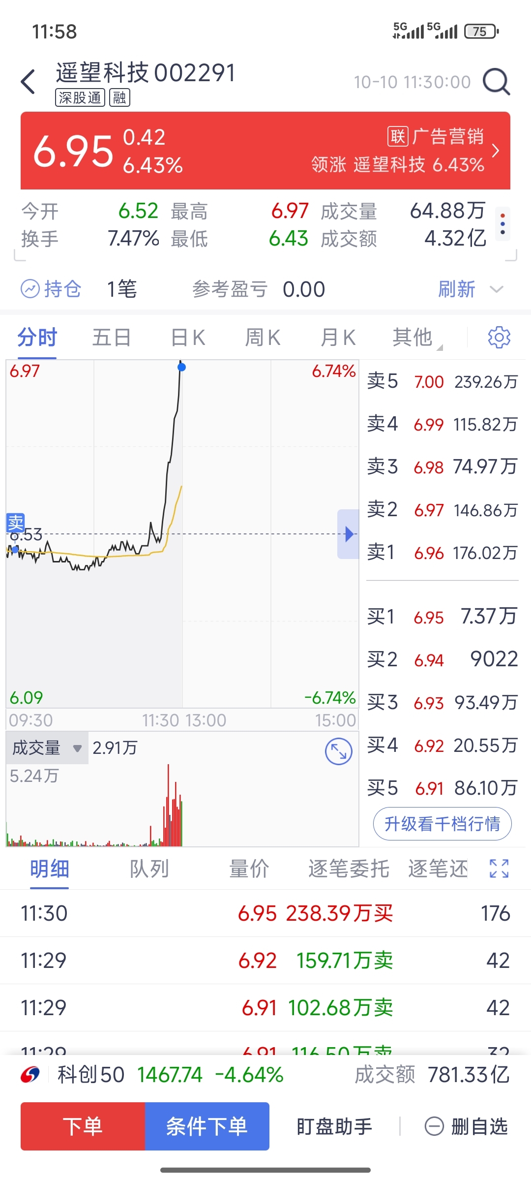 $遥望科技(SZ002291)$ 天塌了,早上要上班,顺手给卖了#炒股日记#