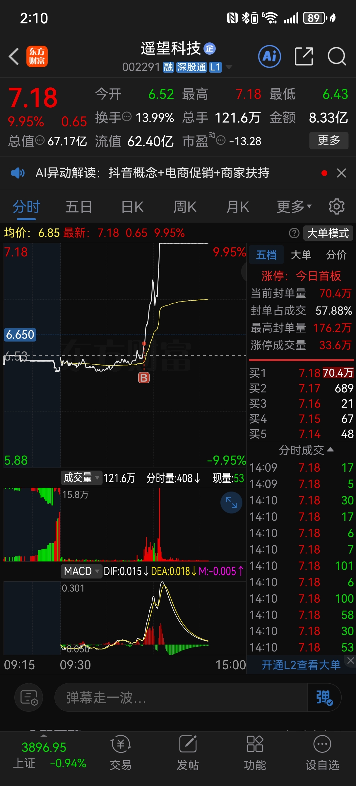 $遥望科技(SZ002291)$ 运气好,今天买了涨停了。明天能出来不?