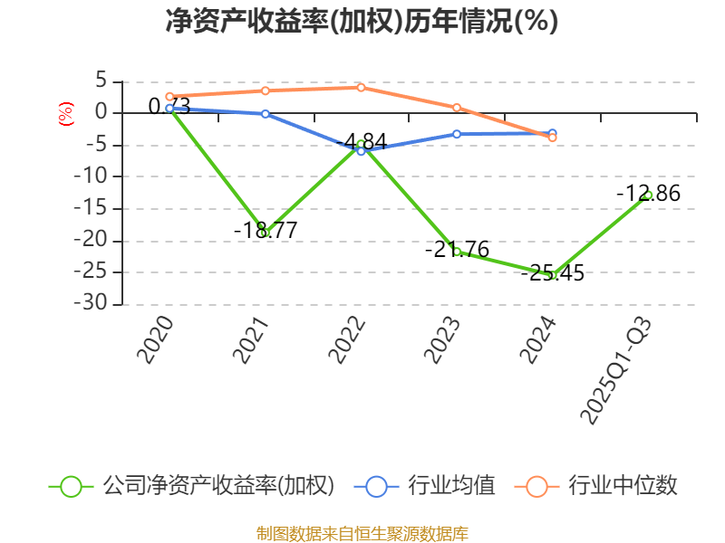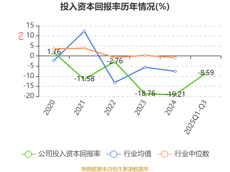 盈利能力方面, 2025年前三季度公司加权平均净资产收益率为-12.86%,同比下降3.21个百分点。公司2025年前三季度投入资本回报率为-8.59%,较上年同期下降1.32个百分点。