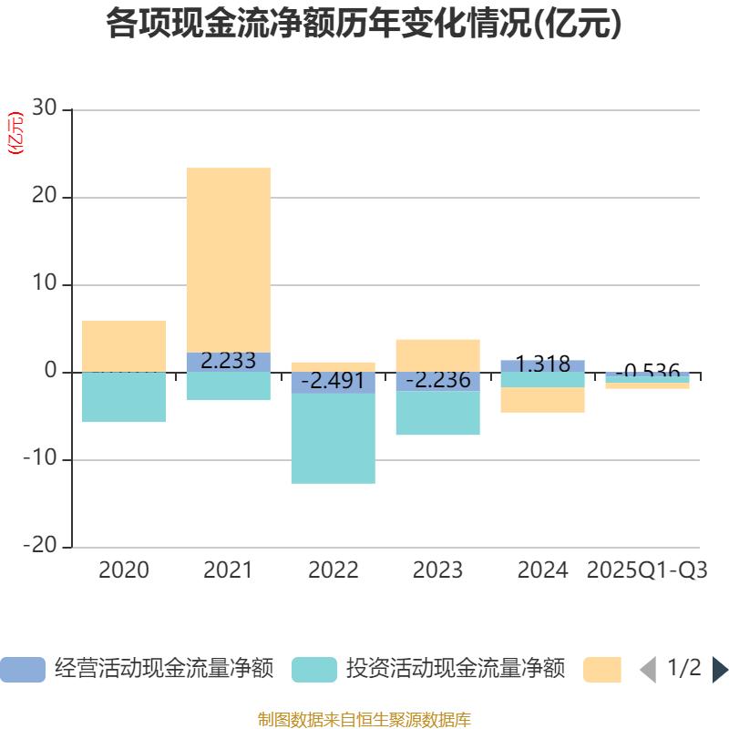 2025年前三季度,公司经营活动现金流净额为-5363.58万元,同比减少1.45亿元;筹资活动现金流净额-6838.58万元,同比增加1.64亿元;投资活动现金流净额-7282.81万元,上年同期为-9490.38万元。