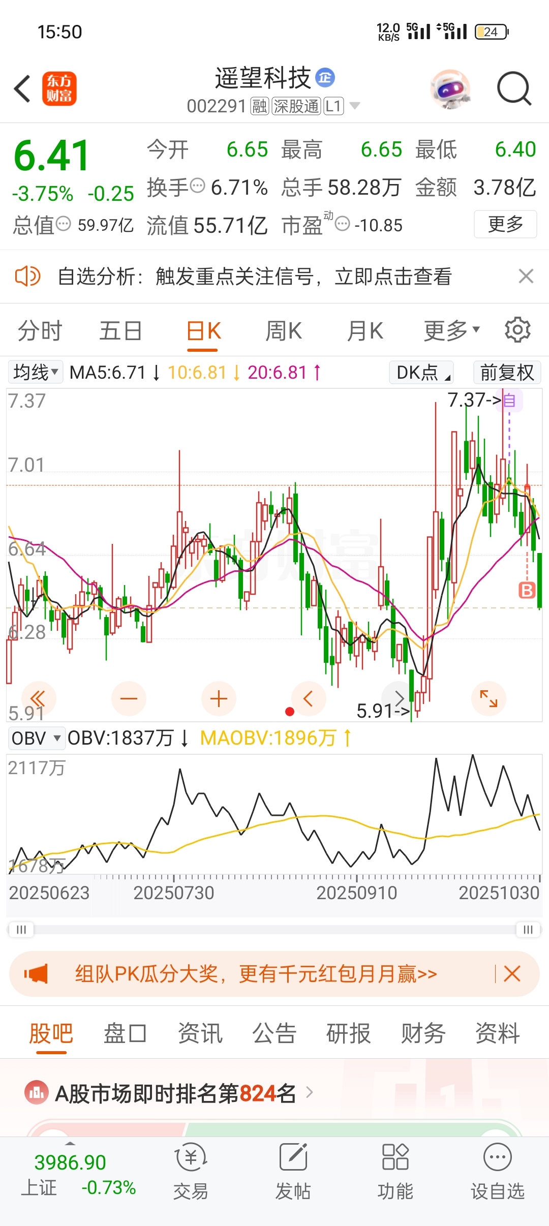 $遥望科技(SZ002291)$ 我也是服了,买了你就跌