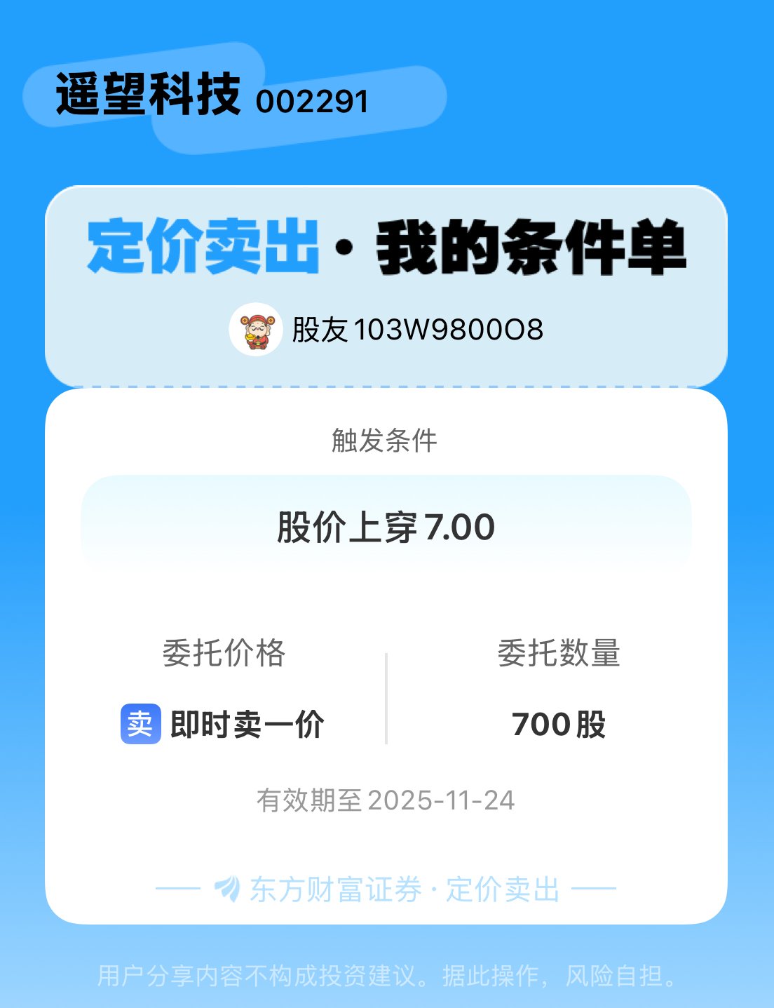 #条件单交流# #定价卖出晒单# 一位股神设置了一个定价卖出条件单,接下来就是见证奇迹的时刻~$遥望科技(SZ002291)$