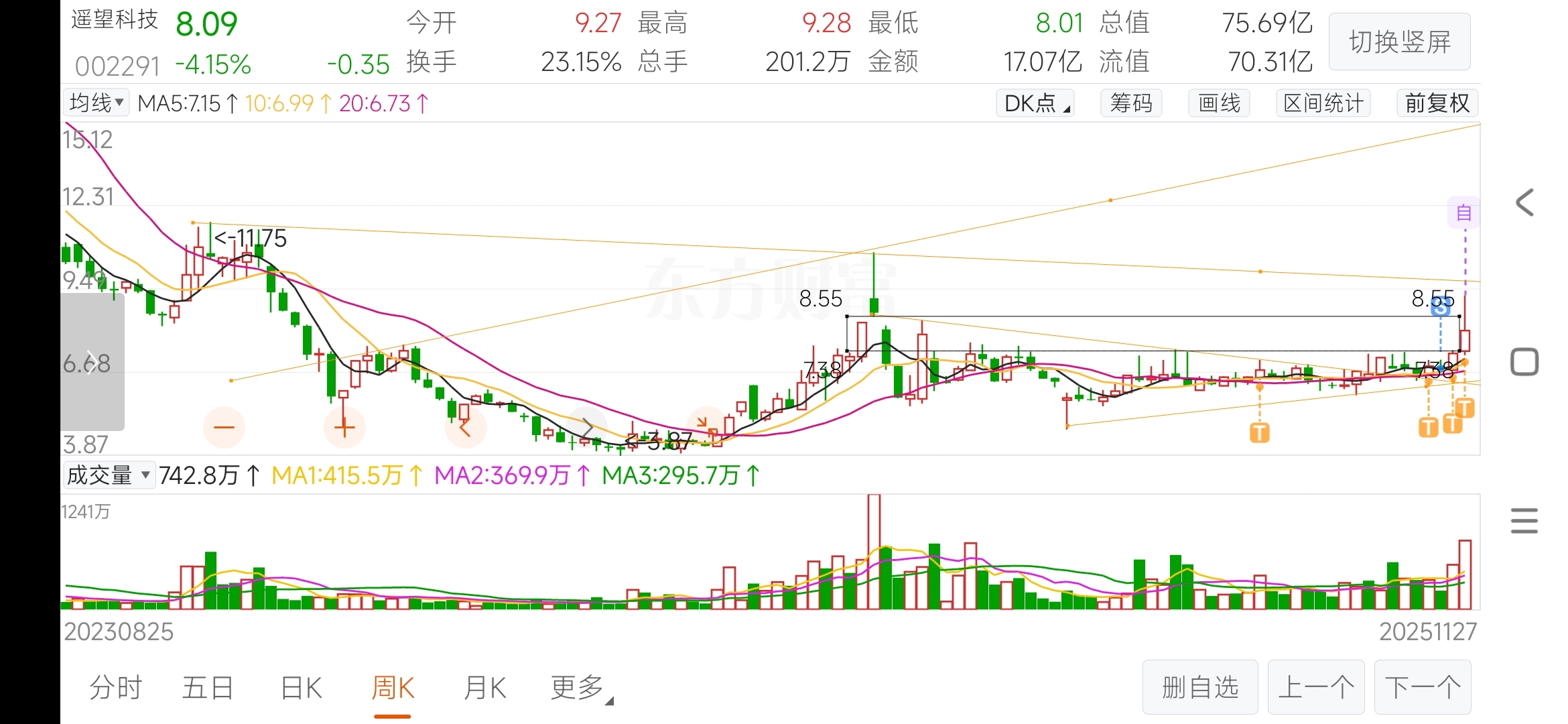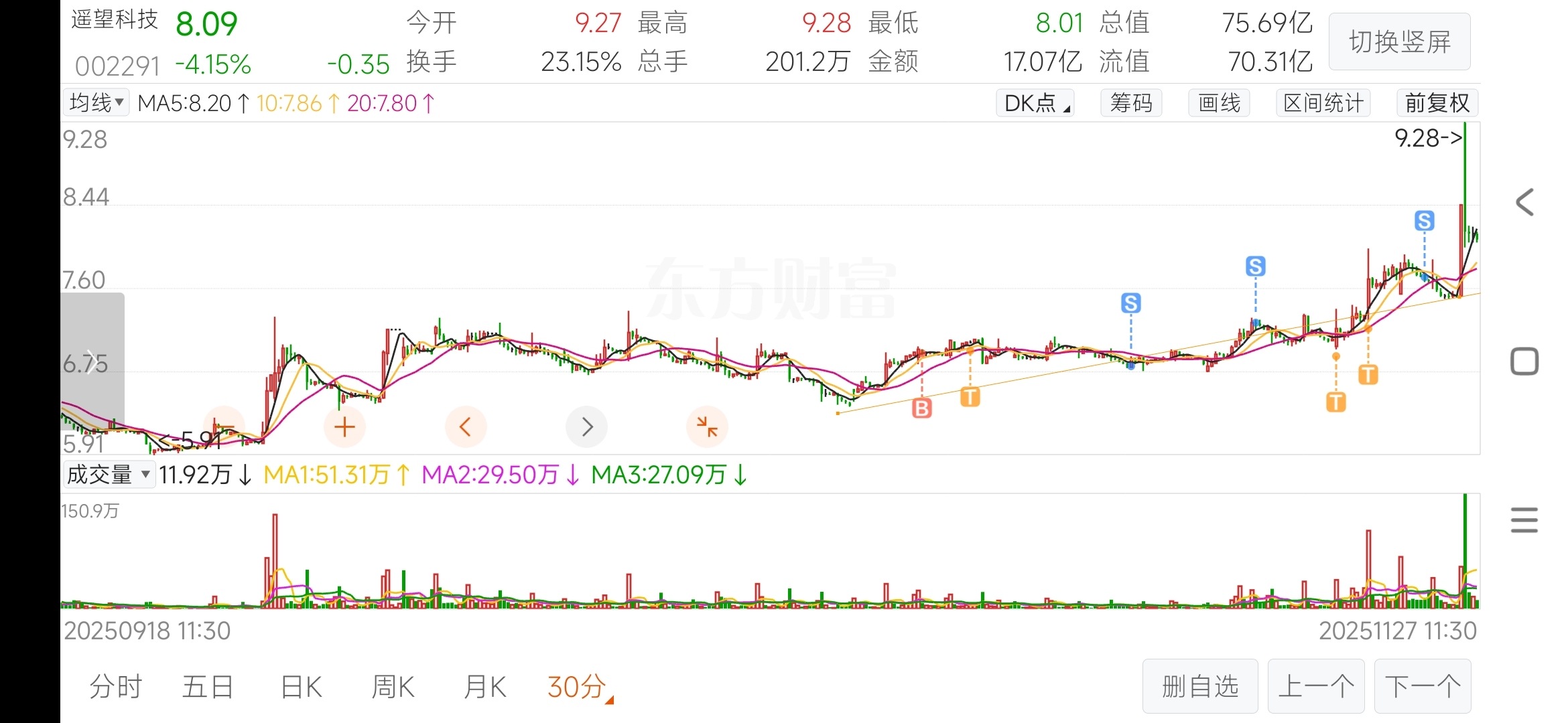 $遥望科技(SZ002291)$ 从底部放量我就进来了,周二看到上不去下午跑的,30分钟有调整需求,本想着周四也就是今天再回去,没想着昨天最后半小时偷袭,那么今天开盘就是卖点,毕竟周线收敛形态空间没有想象的那么大,等技术面的周线下三结构出来我在回来
