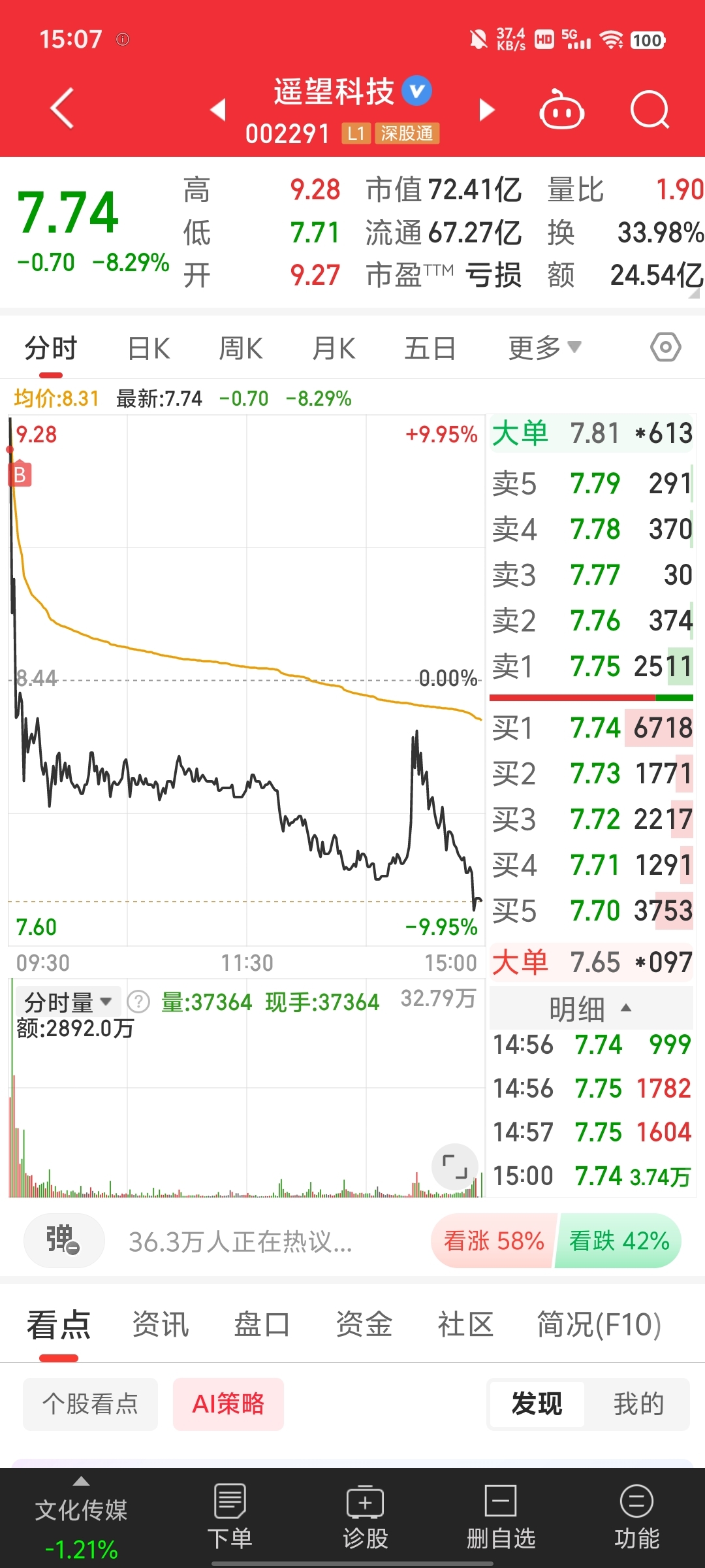 $遥望科技(SZ002291)$ 以此铭记,发誓不再打板。勾币主力今天粗门就妖被创