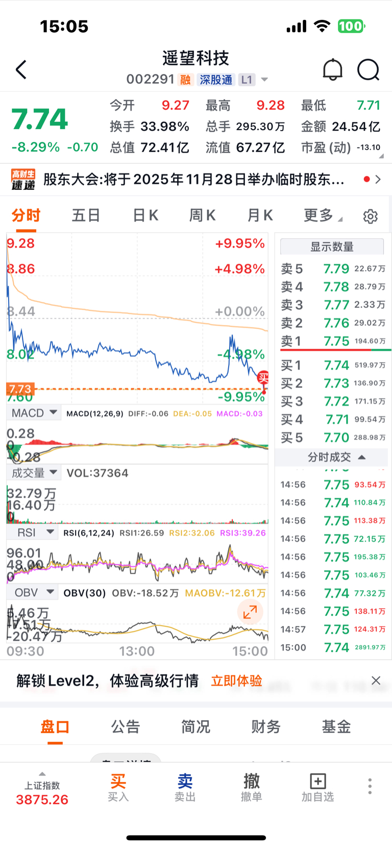 $遥望科技(SZ002291)$ 看明天如何,今天彻底管住手了,尾盘7.72进的!明天跌5个点以上,加一半。