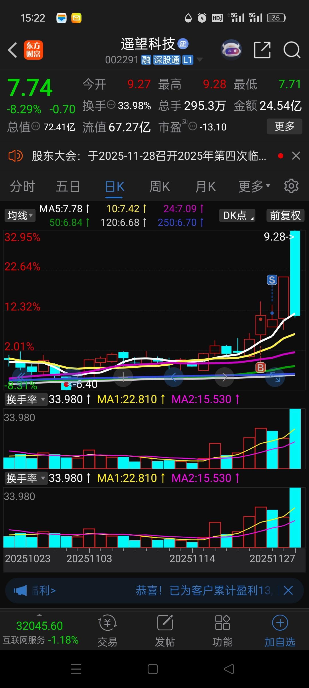 $遥望科技(SZ002291)$ 涨停板没吃到,赚了点瓜子钱走了。