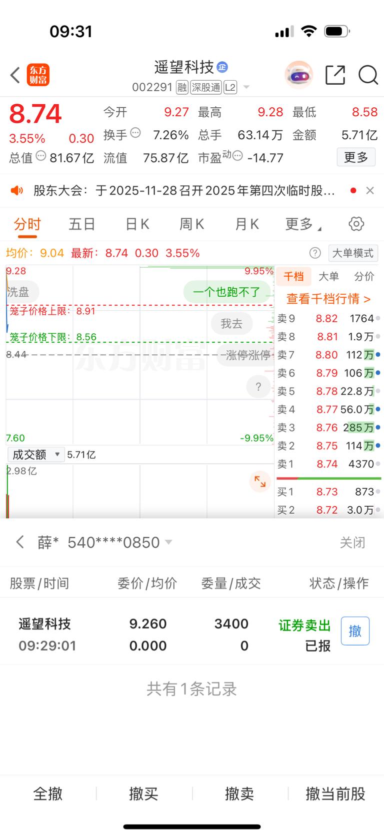 $遥望科技(SZ002291)$ 为什么开盘价9.27,我9点29分挂的9.26没有成交