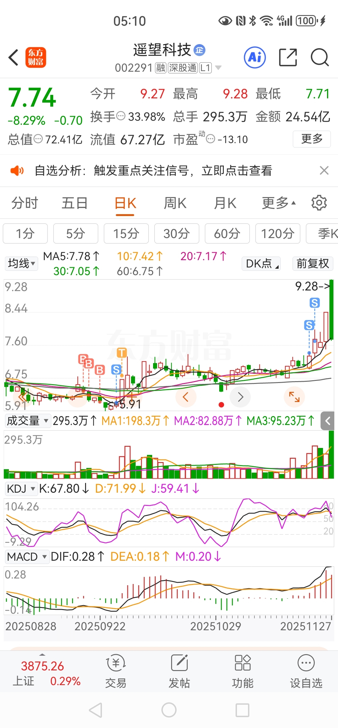 $遥望科技(SZ002291)$ 狗量化,把老子节奏全打乱了。。。本来是走调整的,突然拉个涨停,又来个天地。有病吧。