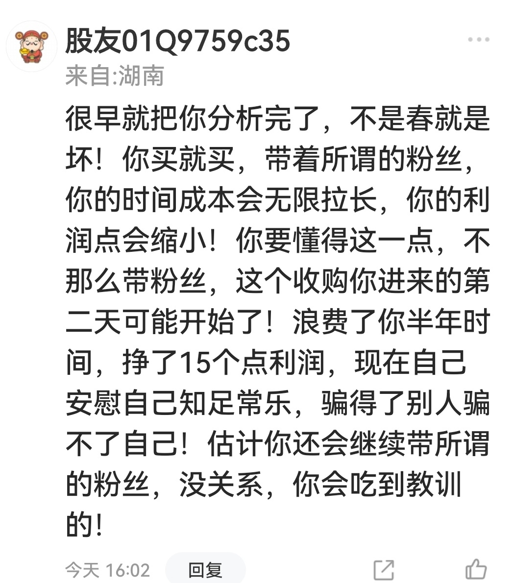郑重声明:用户在财富号/股吧/博客等社区发表的所有信息(包括但不限于文字、视频、音频、数据及图表)仅代表个人观点,与本网站立场无关,不对您构成任何投资建议,据此操作风险自担。请勿相信代客理财、免费荐股和炒股培训等宣传内容,远离非法证券活动。请勿添加发言用户的手机号码、公众号、微博、微信及QQ等信息,谨防上当受骗!